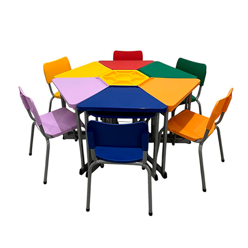 Formatos modernos como trapézio e sextavado facilitam atividades em grupo e métodos pedagógicos colaborativos.